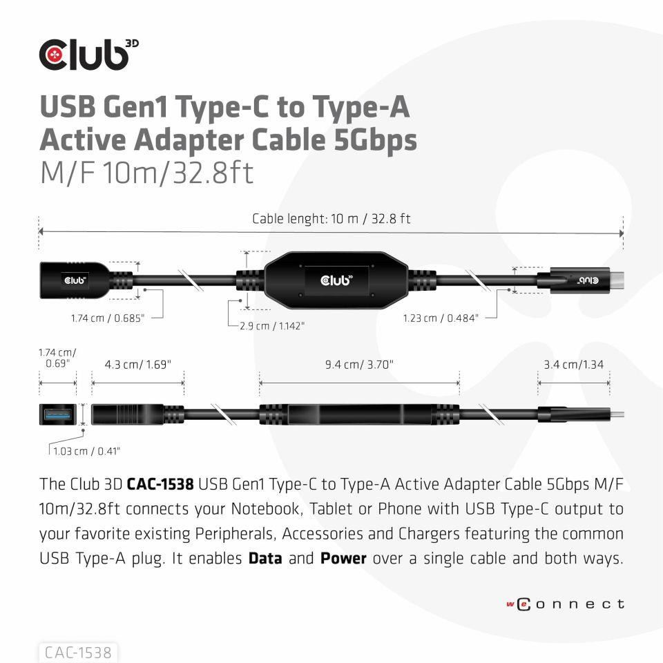Club3D Kabel USB-C na USB-A, Aktivní adaptér/kabel, 5 Gbps (M/F), 10m