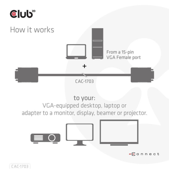 Club 3D CAC-1703 VGA kábel obojsmerný M/M 3m/9.84ft 28AWG spája akýkoľvek stolný počítač, notebook alebo adaptér vybavený VGA s monitorom, displejom, žiaričom alebo projektorom s 15-pinovým portom VGA Female. Kábel je ideálny na použitie doma alebo v práci, vytvára spoľahlivé pripojenie na čokoľvek od hrania hier až po premietanie videa a podporuje rozlíšenie až Full HD 1080p (max. rozlíšenie 1920 x 1080).