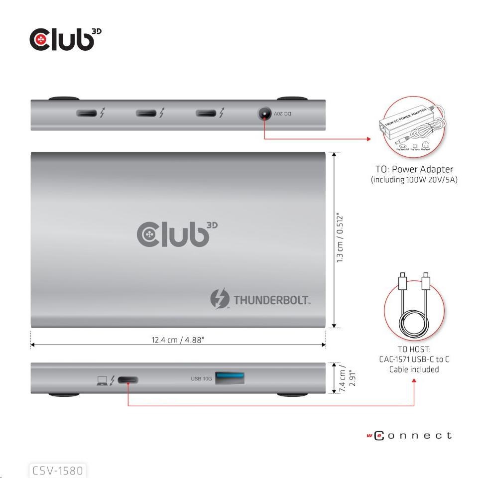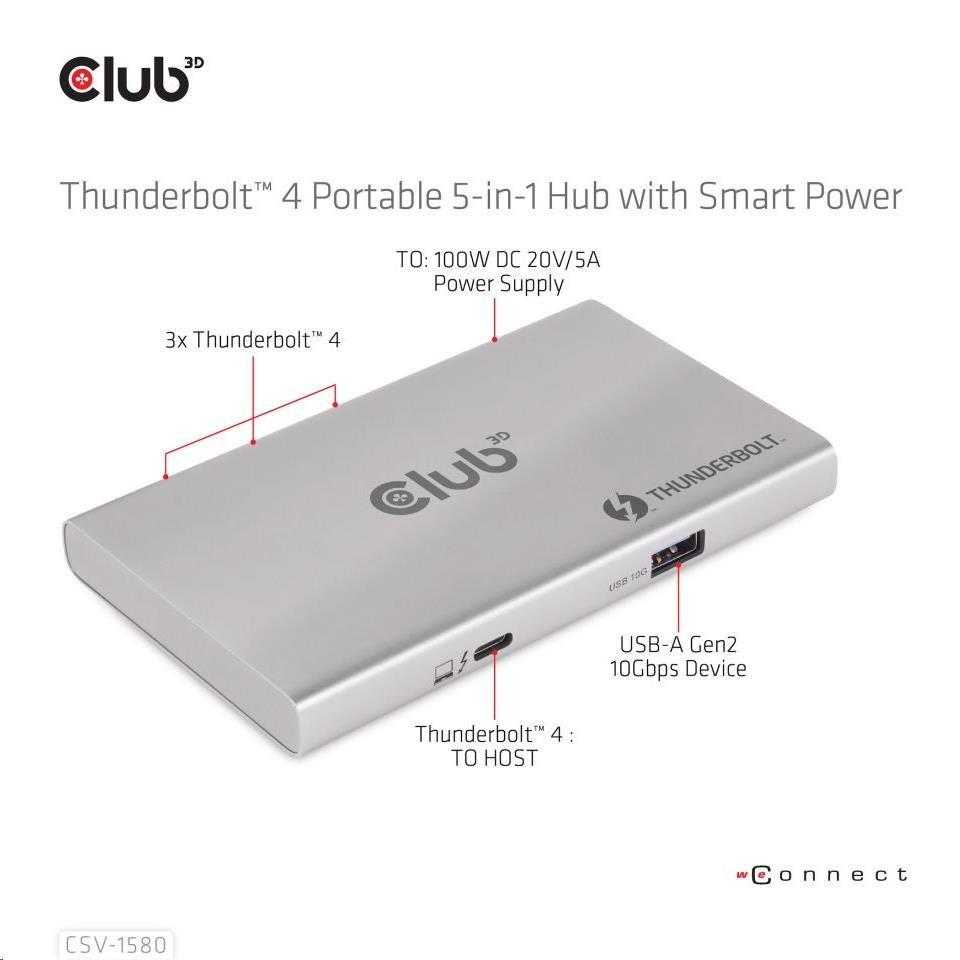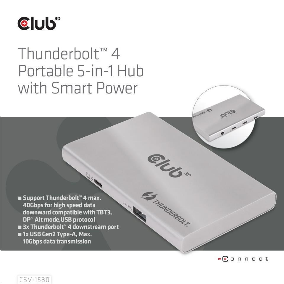 Club 3D CSV-1580 je certifikovaný prenosný rozbočovač Thunderbolt™ 4, ktorý poskytuje najpokročilejšie, najefektívnejšie a najvšestrannejšie dostupné I/O riešenie s rýchlosťou až 40 Gb/s pre dáta a video. Tento moderný rozbočovač Thunderbolt™ 4 má po prvýkrát 3 nadväzujúce porty Thunderbolt™ 4, ktoré umožňujú kaskádové pripojenie zariadení Thunderbolt™ 4 k jednému 8K30Hz alebo dvom 4K60Hz monitorom, možno ho tiež ľahko pripojiť k akémukoľvek zariadeniu USB typu C a súčasne nabíjať počítač. Okrem toho podporuje funkciu Smart Power, ktorá umožňuje rozdeľovať energiu podľa spotreby pripojeného zariadenia a plne tak využívať externý zdroj napájania. Je určený pre počítače PC s rozhraním Thunderbolt™ 4 a počítače Mac™ s rozhraním Thunderbolt™ 3, ktoré používajú systém macOS™ 11 a novšie verzie.