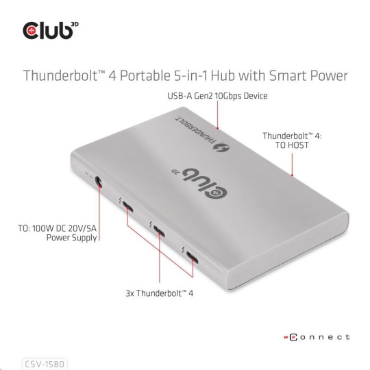 Club 3D CSV-1580 je certifikovaný prenosný rozbočovač Thunderbolt™ 4, ktorý poskytuje najpokročilejšie, najefektívnejšie a najvšestrannejšie dostupné I/O riešenie s rýchlosťou až 40 Gb/s pre dáta a video. Tento moderný rozbočovač Thunderbolt™ 4 má po prvýkrát 3 nadväzujúce porty Thunderbolt™ 4, ktoré umožňujú kaskádové pripojenie zariadení Thunderbolt™ 4 k jednému 8K30Hz alebo dvom 4K60Hz monitorom, možno ho tiež ľahko pripojiť k akémukoľvek zariadeniu USB typu C a súčasne nabíjať počítač. Okrem toho podporuje funkciu Smart Power, ktorá umožňuje rozdeľovať energiu podľa spotreby pripojeného zariadenia a plne tak využívať externý zdroj napájania. Je určený pre počítače PC s rozhraním Thunderbolt™ 4 a počítače Mac™ s rozhraním Thunderbolt™ 3, ktoré používajú systém macOS™ 11 a novšie verzie.