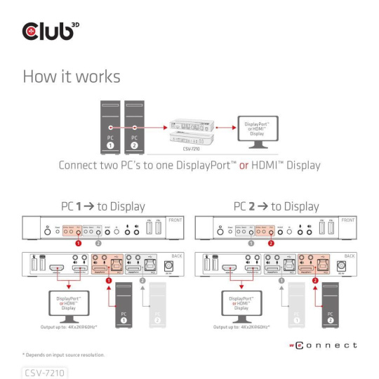 CSV-7210 je vysoko výkonný prepínač KVM (klávesnica, video a myš) s rozhraním DisplayPort™. Presmeruje videá s vysokým rozlíšením až do 4096 × 2160 pri 60 Hz rozlíšení a zvuk z akéhokoľvek zdroja DisplayPort™ na akýkoľvek displej s podporou HDMI™ alebo DisplayPort™. Tento prepínač DisplayPort™ KVM má nielen funkciu prepínania stlačením tlačidla, ale aj inteligentnú funkciu a funkciu hot pluggable.