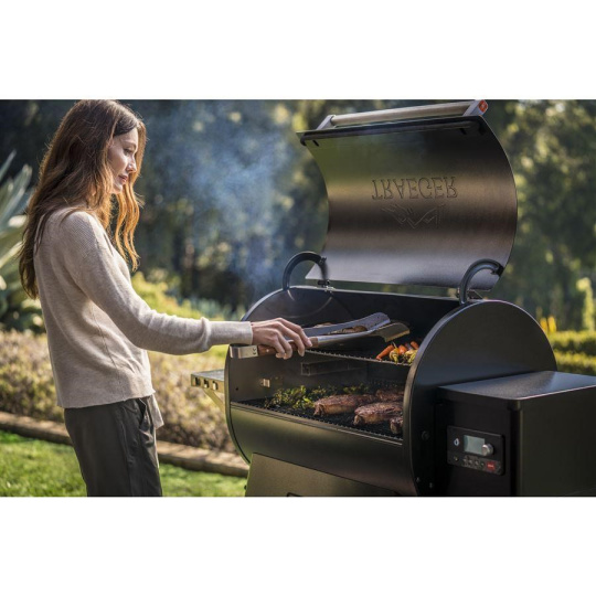 Vlastnosti grilu Traeger zahŕňajú všestranný teplotný rozsah od 165 °F do 500 °F, ideálny na uzení, pečenie, grilovanie aj BBQ, s rýchlym zahrievaním a konštantnou reguláciou teploty vďaka napätiu 120 V AC a výkonom 95 W. Vďaka WiFIRE® pripojeniu a integrovanému senzoru peliet môžete sledovať varenie a hladinu peľ odkiaľkoľvek pomocou aplikácie Traeger. Ponúka veľkú varnú plochu 1651 cm2 na dvoch radoch porcelánom potiahnutých oceľových roštov a je navrhnutý s izolovanou konštrukciou s dvojitou stenou na zníženie kolísania teploty. Súčasťou je aj sonda na mäso Traeger pre jednoduchú kontrolu vnútorných teplôt, funkcia Super Smoke na vylepšenie chuti drevného uzení a pohodlné čistenie zásobníka na rýchlu výmenu peliet. Gril sa pripája k elektrickej siete pomocou priloženého 6 ft D2 NEMA napájacieho kábla.