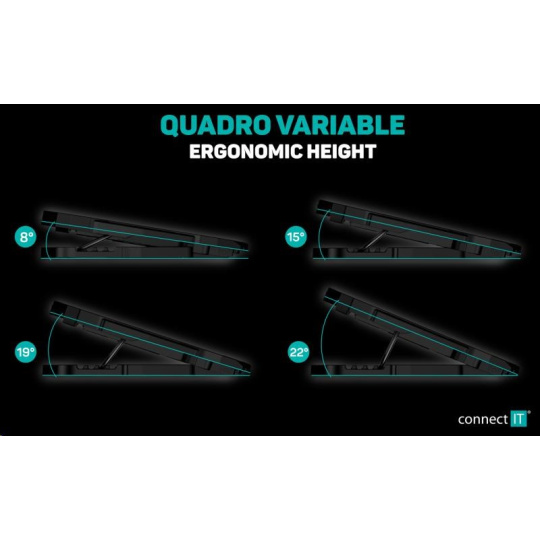 Podložka zabezpečuje odvod tepla z notebooku a jeho vetracích otvorov, ako aj priame chladenie krytu notebooku prostredníctvom cirkulácie chladného vzduchu, čím zlepšuje celkový výkon notebooku. Je plne kompatibilný s notebookmi do veľkosti 15,6" a vďaka kompaktným rozmerom je ideálny na prácu doma a v kancelárii, ako aj na cestovanie a časté prenášanie. Mimoriadne tichá prevádzka 4 ventilátorov vás nebude rušiť ani pri najnáročnejšej práci vyžadujúcej maximálnu koncentráciu. Nastaviteľná výška v 4 rôznych úrovniach zaručuje maximálne pohodlie aj počas dlhšej práce alebo hrania hier.