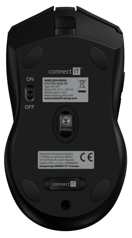 - Prepínač zapnutia/vypnutia na úplné vypnutie myši s cieľom šetriť batériu