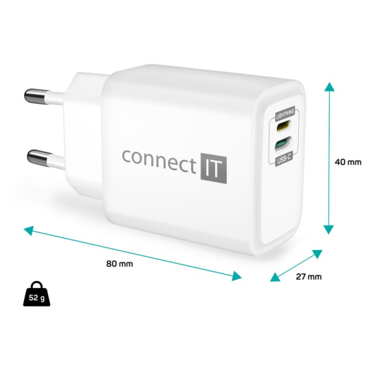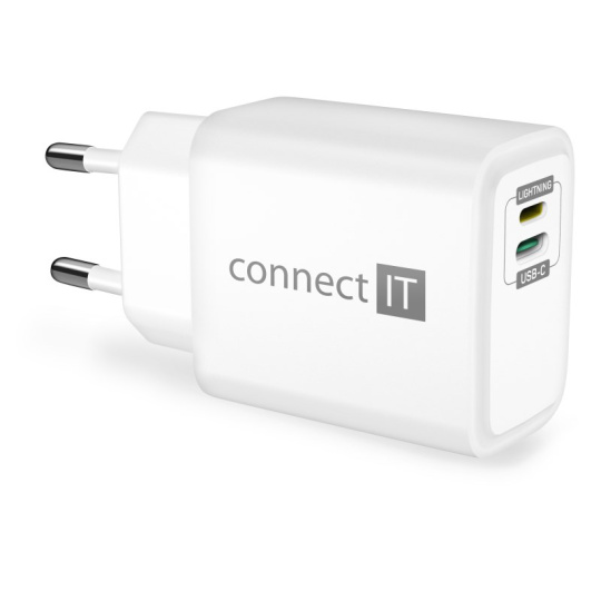 Unikátna cestovná nabíjačka CONNECT IT "Duplex" disponuje dvomi portmi - Lightning a USB-C. Vďaka tejto jedinečnej technológii je možné nabíjať zariadenia s Lightning vstupom, ako aj USB-C vstupom, jedným univerzálnym káblom. Nabíjačka je určená na napájanie a nabíjanie mobilných telefónov, tabletov, power bankov, akčných kamier, elektronických čitateľov kníh, MP3 a MP4 prehrávačov, herných konzol a mnohých ďalších prenosných zariadení doma, v kancelárii aj na cestách. Technológia Power Delivery (PD) umožňuje rýchlonabíjanie s výkonom 20 W. Súčasťou balenia je aj veľmi kvalitný kábel Lightning -> USB-C, ktorý dokáže preniesť až 27 W.
