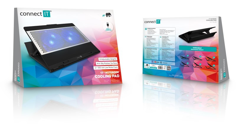 Chladiaca podložka pod notebook so štyrmi šesťrýchlostnými ventilátormi, digitálnym displejom, 4-stupňovým nastavením výšky a dvoma portmi USB. Podložka zabezpečuje odvod tepla z notebooku a jeho vetracích otvorov, ako aj priame chladenie krytu notebooku prostredníctvom cirkulácie chladného vzduchu, čím zlepšuje celkový výkon notebooku. Je plne kompatibilný s notebookmi do veľkosti 15,6" a vďaka kompaktným rozmerom je ideálny na prácu doma a v kancelárii, ako aj na cestovanie a časté prenášanie. Mimoriadne tichá prevádzka 4 ventilátorov vás nebude rušiť ani pri najnáročnejšej práci vyžadujúcej maximálnu koncentráciu. Nastaviteľná výška v 4 rôznych úrovniach zaručuje maximálne pohodlie aj počas dlhšej práce alebo hrania hier.