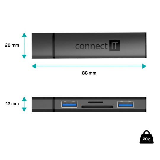 CONNECT IT Hub Compact 4v1, 2xUSB 3.0, 1xSD, 1xMicroSD, externí, černá