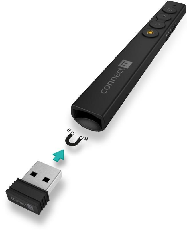 - Úložný priestor v spodnej časti prezentéra pre mini USB prijímač, ideálny pri transporte aj cestovaní
