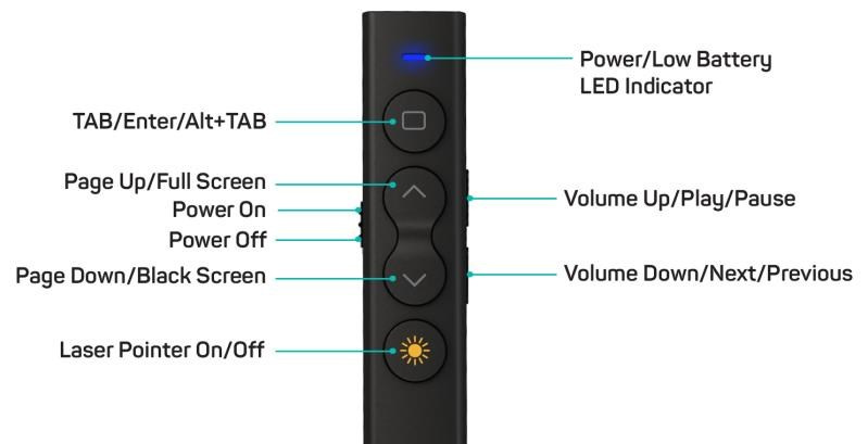 | Funkcie prezentéra | - TAB/ENTER/ALT+TAB - PAGE UP/FULL SCREEN - PAGE DOWN/BLACK SCREEN - VOLUME UP/PLAY/PAUSE - VOLUME DOWN/NEXT/PREVIOUS |