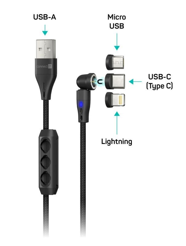 CONNECT IT Magnetický kabel PowerLink 3v1, USB-C / Lightning / MicroUSB, 2m, černá