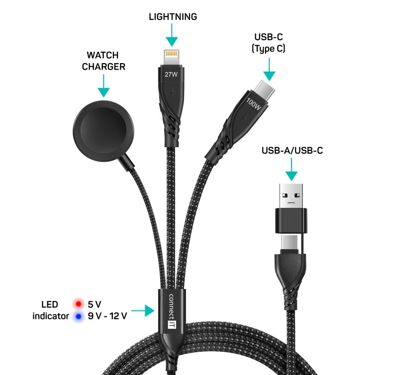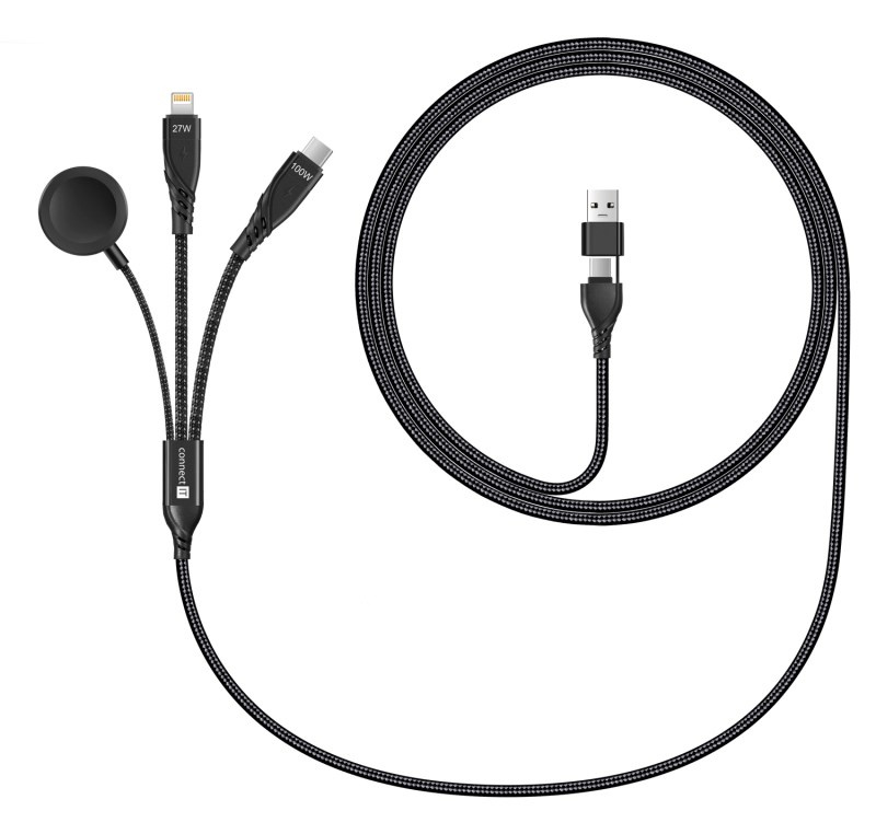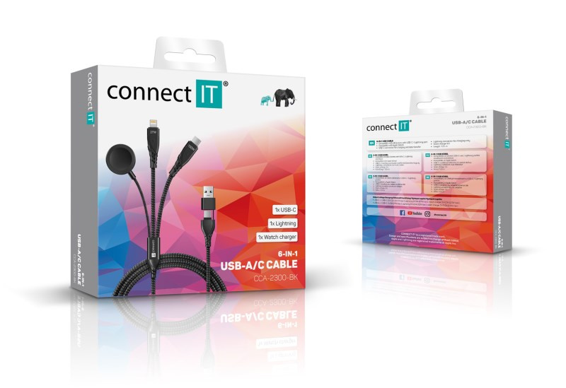 Univerzálny nabíjací kábel 6v1 pre nabíjanie zariadení s konektormi 1x USB-C, 1x Lightning a 1x nabíjačka na chytré hodinky (kompatibilná s Apple Watch) so vstupným konektorom USB-C a redukciou na USB-A. Umožňuje nabíjanie až troch zariadení súčasne s podporou rýchleho nabíjania pomocou max. prúdového toku 5 A. Špeciálna manžetová nadstavba konektorov zaručuje lepšiu dostupnosť k nabíjacím zásuvkám mobilných telefónov v puzdrá.
