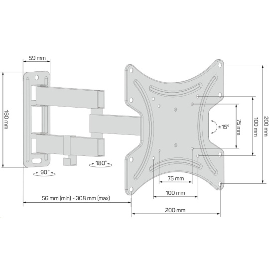 Rozmery držiaka pri maximálnej vzdialenosti od steny (š x v x h): 220 x 220 x 308 mm