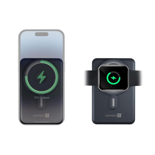 Bezdrôtová MagSafe powerbanka s kapacitou 10000 mAh kompatibilná s Apple iPhone a Apple Watch. Disponuje integrovaným USB-C a Lightning káblom. Podporuje až 20 W rýchlonabíjanie pomocou USB-C kábla.