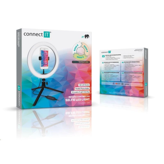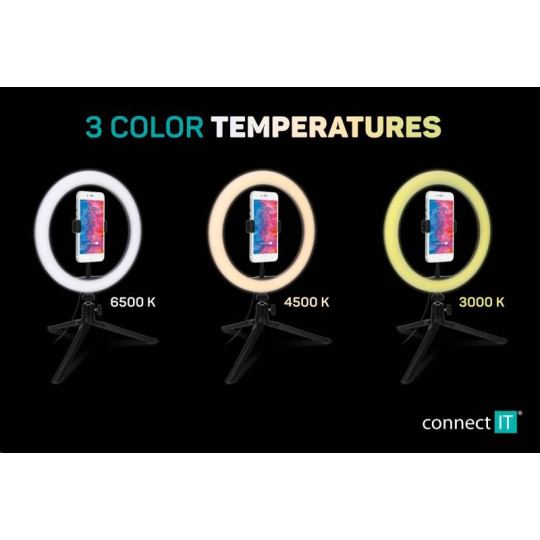 Kruhové selfie LED svetlo "Selfie10Ring" s flexibilným držiakom na mobilný telefón a statívom s guľovou hlavou pre domáce aj profesionálne použitie umožňuje nastaviť farebnú teplotu svetla na 3 rôzne úrovne (3000/4500/6500 K). Súčasťou výbavy je diaľkové ovládanie na kábli.