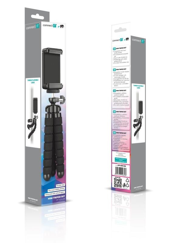 Mini Tripod set s flexibilnými nohami, ktoré je možné prichytiť napríklad na vetvy stromov, zábradlia, riadidlá bicykla alebo na monitor počítača a mnoho ďalších miest a rôznych uhlov. Gumené zakončenie nôh zaručuje stabilitu na akomkoľvek povrchu. Mini tripod set je veľmi skladný a.vmestí sa do každého batohu alebo kabelky, v zloženom stave meria 24,5 cm a váži len 76 g. Maximálne zaťaženie je 0,5 kg. Súčasťou Mini Tripod setu je držiak, ktorý sedí na šírku väčšiny telefónov na trhu a je možné ho v ňom umiestniť ako na šírku, tak na výšku, podľa potreby používateľa.
