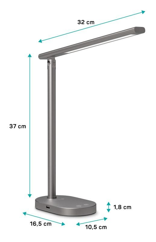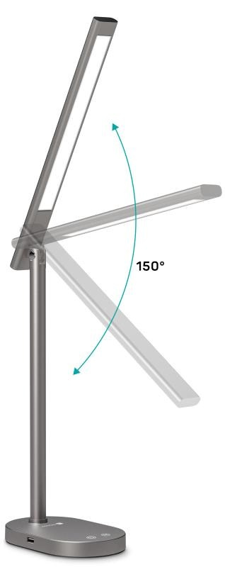 Vďaka sklopnému ramenu nastavíte dokonalý uhol pre akúkoľvek prácu. Lampička disponuje USB-A výstupom s výkonom 5 W a dvomi praktickými dotykovými spínačmi, ktoré umožňujú zapnúť/vypnúť lampu, nastaviť 3 úrovne jasu svetla alebo nastaviť farebnú teplotu svetla v 3 rôznych úrovniach (3000/4000/6500 K).