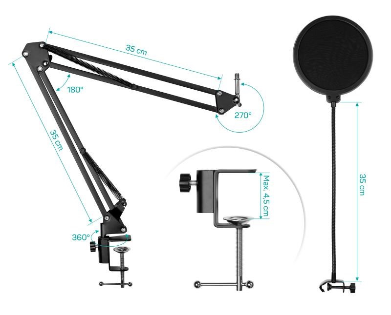 - Teleskopické rameno s pružinovým mechanizmom a tromi kĺbmi na jednoduché nastavenie výšky a uhla mikrofónu