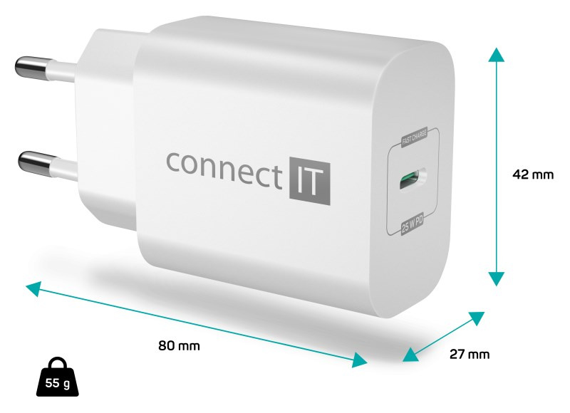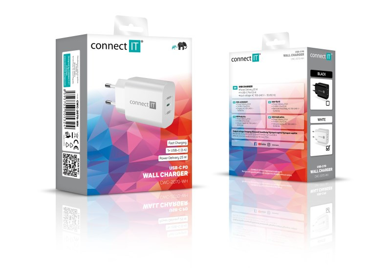 Cestovná USB nabíjačka CONNECT IT "Voyager2" určená na napájanie aj nabíjanie mobilných telefónov, tabletov, power bankov, akčných kamier, elektronických čítačiek kníh, MP3 a MP4 prehrávačov, herných konzolí a mnohých ďalších prenosných zariadení doma, v kancelárii aj na cestách. Technológia Power Delivery (PD) umožňuje rýchlonabíjanie s výkonom 25 W.