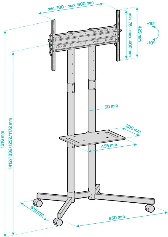 Veľmi praktický pojazdný stojan je určený pre variabilné umiestnenie TV kdekoľvek v interiéri. Vďaka stojanu môžete premiestňovať TV rýchlo a pohodlne kamkoľvek podľa potreby. Navyše je vybavený praktickou poličkou na DVD, Set-top box atď. Robustná konštrukcia z ocele unesie spoľahlivo až 40 kg obrazovku. Policová má nosnosť 10 kg. Stojan je kompatibilný s obrazovkami do uhla do 70" a pre najvyššiu možnú stabilitu je vybavený kolieskami s brzdovou mechanikou proti nechcenému pojezdu.