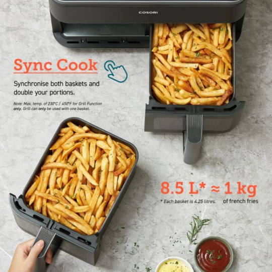 Kapacita každého samostatného koša teplovzdušnej fritézy Cosori Dual Basket je 4,25l, jej celková kombinovaná kapacita je teda až 8,5l. Vďaka tomuto obrovskému objemu môžete bez obáv pripravovať 2 rôzne chody pre celú rodinu, alebo dvojnásobné množstvo jedného chodu pre rodinu a priateľov.