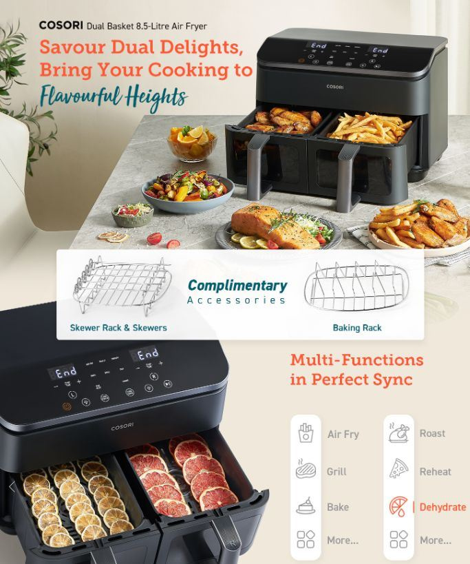 Cosori Dual Basket horkovzdušná fritéza 8.5l + 5x špíz a rošt