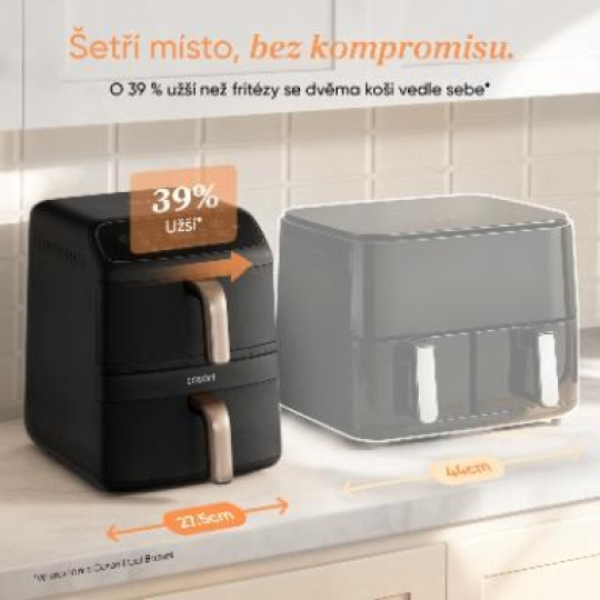 Vďaka svojmu vertikálnemu dizajnu zaberá Cosori Turbo Tower™ Compact o 39 % menej miesta ako tradičné fritézy s dvoma košíkmi. Aj pri šírke iba 27,5 cm ponúka plný objem 8,6 litra. Vďaka tomu máte na pracovnej doske viac miesta bez obmedzenia výkonu alebo objemu. Ideálne riešenie pre moderné a menšie kuchyne.