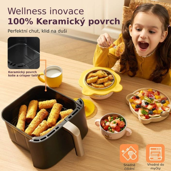 Zdravé varenie teraz nadobúda úplne nový význam. Vďaka keramickému povrchu košov a až o 95 % nižšej spotrebe oleja si môžete vychutnať vyprážané jedlo oveľa zdravšie a predovšetkým chutnejšie. Integrácia inteligentnej aplikácie vám umožňuje ovládať teplovzdušnú fritézu na diaľku, vďaka čomu máte prístup k tisícom receptov a priebežnému stavu prípravy, čo vám uľahčí prípravu zdravých a chutných jedál. Vďaka siedmim všestranným funkciám vrátane fritovania, pečenia, grilovania, sušenia alebo kysnutia ide o skutočne multifunkčné zariadenie, ktoré obohatí vašu kuchyňu o nekonečné možnosti varenia. Vďaka pripojeniu Wi-Fi môžete fritézu dokonca ovládať a monitorovať na diaľku a pomocou aplikácie máte prístup k receptom a výživovým tipom.