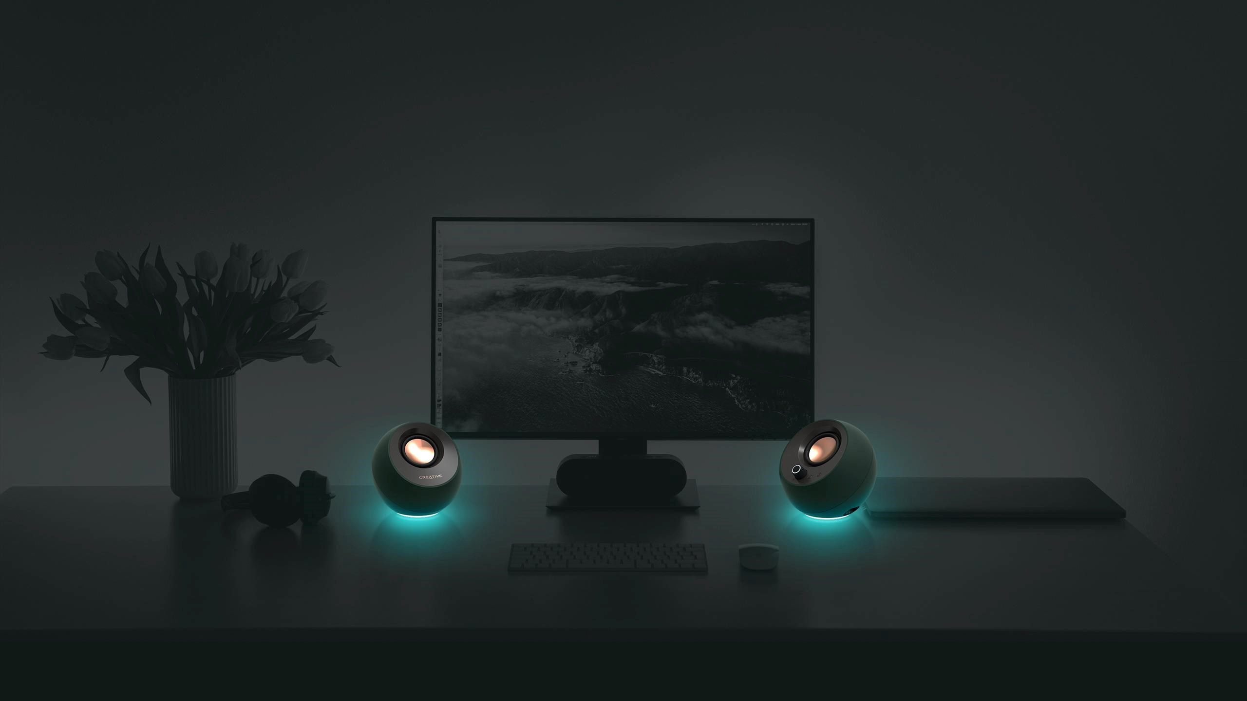 Vďaka širokému výberu farieb a 3 svetelným efektom si môžete vybrať nastavenie, ktoré bude vyhovovať konkrétnej požadovanej atmosfére. Osvetlenie RGB reproduktorov Creative Pebble Pro dokáže prechádzať spektrom farieb, pulzovať do rytmu alebo len svietiť jednobarevným žiarením. Keď je čas skončiť, RGB sa dá ľahko vypnúť pomocou ovládacieho tlačidla RGB.
