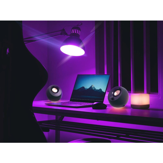 Teraz s nastaviteľným osvetlením RGB! Reproduktory Creative Pebble Pro umožňujú výber zo širokého spektra farieb a troch svetelných efektov pomocou jednoduchého nastavenia typu plug-and-play.