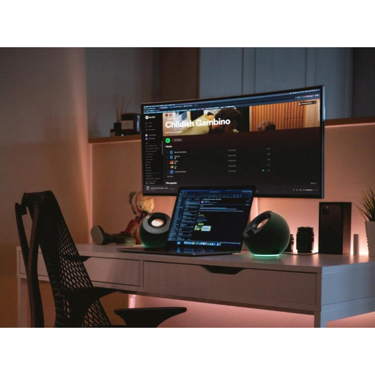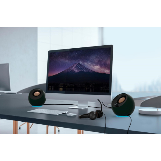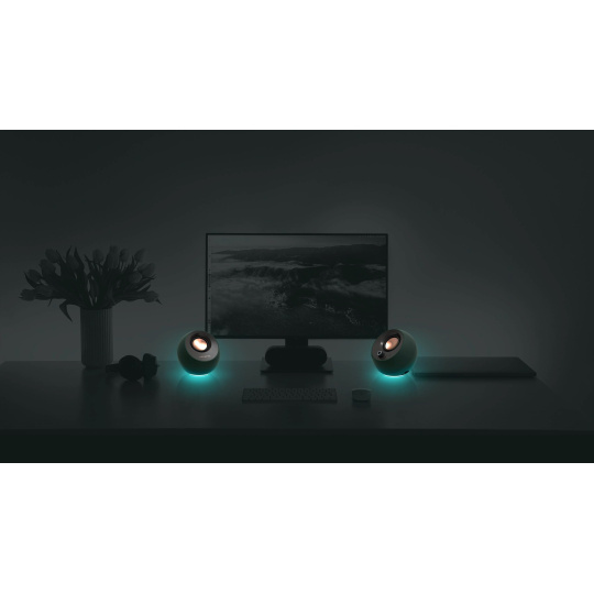 Vďaka širokému výberu farieb a 3 svetelným efektom si môžete vybrať nastavenie, ktoré bude vyhovovať konkrétnej požadovanej atmosfére. Osvetlenie RGB reproduktorov Creative Pebble Pro dokáže prechádzať spektrom farieb, pulzovať do rytmu alebo len svietiť jednobarevným žiarením. Keď je čas skončiť, RGB sa dá ľahko vypnúť pomocou ovládacieho tlačidla RGB.