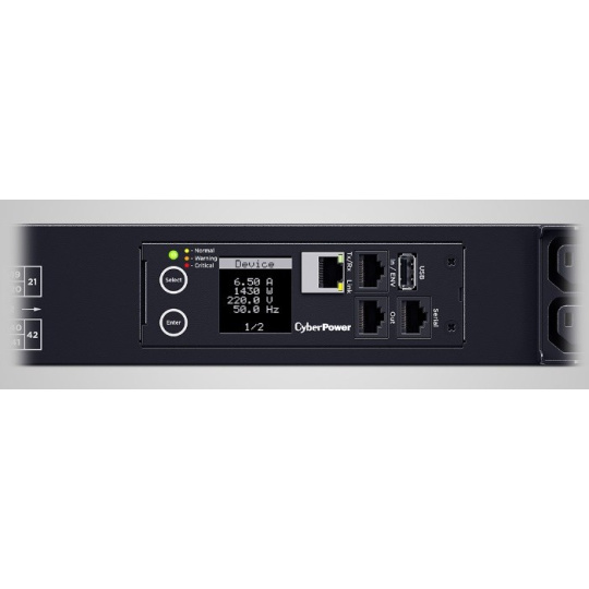 CyberPower PDU31406 Rozvodná jednotka (PDU) distribuuje napájanie pre viac zariadení prostredníctvom štandardných zásuviek, ktoré je možné použiť s bezpečnostnými a sledovacími systémami, telekomunikačnými zariadeniami, sieťovými zariadeniami, NAS / pamäťovými zariadeniami, satelitnými zariadeniami, multimediálnymi zariadeniami a pracovnými stanicami. Multifunkčný displej LCD dokáže zobrazovať presné podmienky napájania a používatelia môžu meniť jeho farbu, aby ľahko odlíšili zariadenia. Okrem toho je displej LCD výmenný za prevádzky kvôli ľahkej údržbe a má automatickú orientáciu LCD displeja pre jednoduché sledovanie.