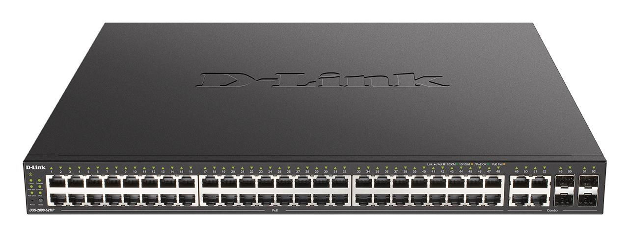 D-Link DGS-2000-52MP je plne riadený 52portový gigabitový riadený PoE switch pre podnikové siete. Prepínač je vybavený 48 portami 10/100/1000M RJ-45 s rozhraním 802.3at PoE+ (max. 30 W na port) a štyri kombinované gigabitové porty Combo RJ-45/SFP s podporou 100M a 1000M vysielačov SFP (Mini-GBIC) na optické prepojenie. Celkový výkon PoE prepínača je 370 W. Aktívne chladenie prepínača zabezpečujú tri inteligentne riadené ventilátory. Súčasťou balenia sú konzoly na montáž do 19" stojanov. Prepínače D-Link radu DGS-2000 ponúkajú komplexnú sadu funkcií L2, bezpečnostných funkcií, funkcií kvality služieb (QoS) a základných funkcií L3 (max. 4 IP rozhrania, statické smerovanie s max. 128 záznamov IPv4/IPv6, predvolená trasa, IPv6 Neighbor Discovery). Riešenie prípadných problémov so sieťou uľahčuje štandard 802.3ah OAM, diagnostika káblov a jednosmerná detekcia prepojenia D-Link (DULD). Poskytovatelia internetových služieb ocenia funkcie Q-in-Q (Port Based), Multicast VLAN (ISM VLAN) alebo IGMP Authentication/Filtering na efektívnu prevádzku služieb IPTV. Prepínač sa spravuje prostredníctvom webového rozhrania, sériovej konzoly CLI, príkazov Telnet, SLL, SSH alebo SNMP. Na počiatočnú konfiguráciu a základnú správu je k dispozícii bezplatný softvérový nástroj D-Link Network Assistant (DNA) a mobilná aplikácia, zatiaľ čo na centrálnu správu väčších sietí je k dispozícii pokročilá platforma D-View 7...