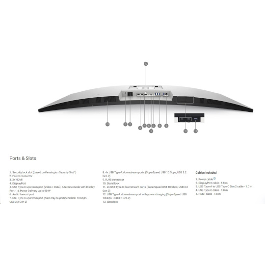 | 1. Security lock slot (based on Kensington Security Slot™) 2. Power connector 3. 2x HDMI 4. DisplayPort 5. USB Type-C upstream port (Video + Data). Alternate mode with Display Port 1.4, Power Delivery up to 90 W 6. Audio line-out port 7. USB Type-C upstream port (data only, SuperSpeed USB 10 Gbps, USB 3.2 Gen 2) 8. 4x USB Type-A downstream ports (SuperSpeed USB 10 Gbps, USB 3.2 Gen 2) 9. RJ45 connector 10. Stand lock 11. 2x USB Type-C downstream ports (SuperSpeed USB 10 Gbps, USB 3.2 Gen 2) 12. USB Type-A downstream port with power charging (SuperSpeed USB 10Gbps, USB 3.2 Gen 2) 13. Speakers |