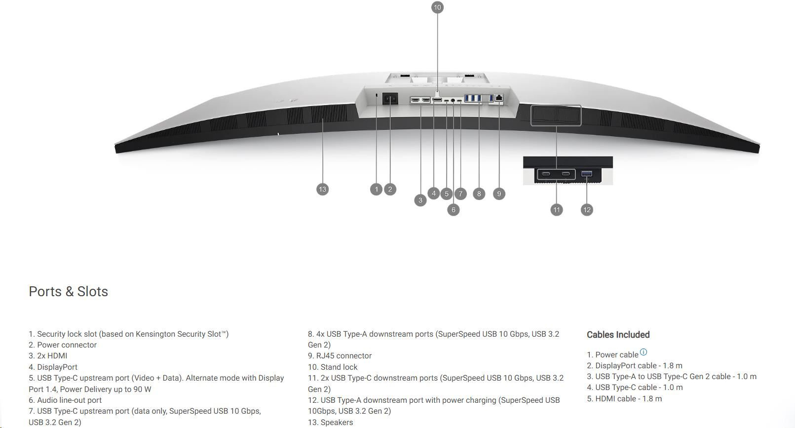 | 1. Security lock slot (based on Kensington Security Slot™) 2. Power connector 3. 2x HDMI 4. DisplayPort 5. USB Type-C upstream port (Video + Data). Alternate mode with Display Port 1.4, Power Delivery up to 90 W 6. Audio line-out port 7. USB Type-C upstream port (data only, SuperSpeed USB 10 Gbps, USB 3.2 Gen 2) 8. 4x USB Type-A downstream ports (SuperSpeed USB 10 Gbps, USB 3.2 Gen 2) 9. RJ45 connector 10. Stand lock 11. 2x USB Type-C downstream ports (SuperSpeed USB 10 Gbps, USB 3.2 Gen 2) 12. USB Type-A downstream port with power charging (SuperSpeed USB 10Gbps, USB 3.2 Gen 2) 13. Speakers |