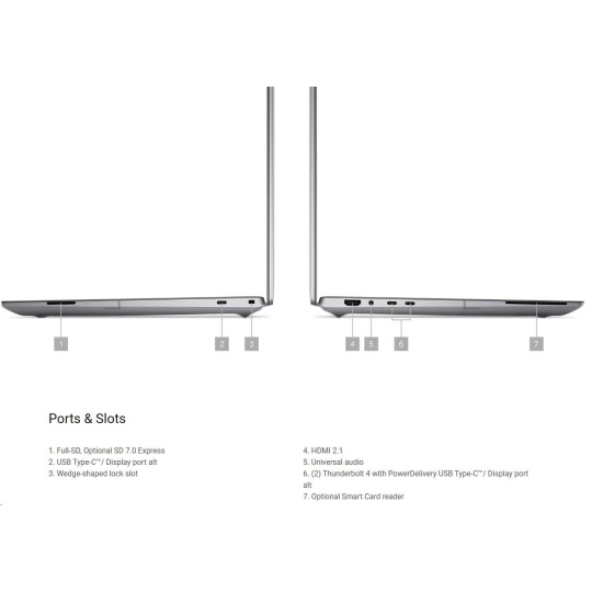 | Full-SD, Optional SD 7.0 Express USB Type-C™/ Display port alt Wedge-shaped lock slot HDMI 2.1 Universal audio (2) Thunderbolt 4 with PowerDelivery USB Type-C™/ Display port alt Optional Smart Card reader |