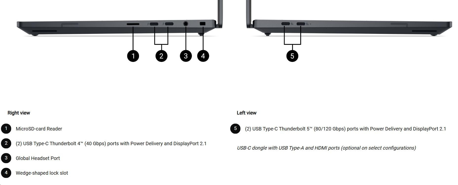• (2) USB Type-C Thunderbolt 5™ (80/120 Gbps) ports with Power Delivery and DisplayPort 2.1
