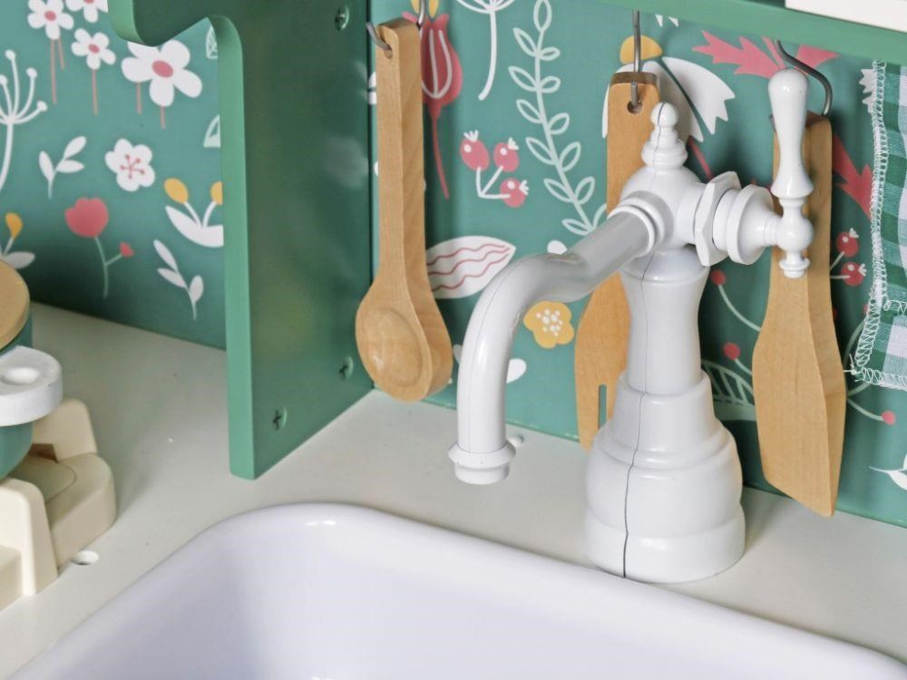 Detská kuchynka v krásnych farbách, s kvetinovým vzorom, je štýlovou edukačnou hračkou pre deti od 3 rokov veku. V drevenej kuchynke s modernými spotrebičmi deti vypustia uzdu svojej fantázii, môžu pripravovať jedlá, uvariť kávu a pokojne vyprať špinavé prádlo. Jednoducho si vyskúšať dospelácke činnosti bezpečným detským spôsobom. Reálny nádych celej hre dodá sporák so svetelnými a zvukovými efektmi.