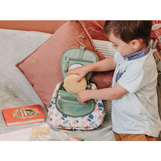Kosmetická taška na zavešenie, v neutrálnej zelenej farbe, s roztomilým lenochodom, je originálnou detskou toaletnou taškou na cesty. Veľmi pevná a odolná kozmetická taška, so veľkým množstvom vreciek a odnímateľným zrkadlom, pohodlne pojme hygienické potreby vašej dievčatka alebo chlapca. Vodoodpudivý materiál umožní deťom používať tašku v kúpeľni aj vo vani. Vďaka háčiku ju jednoducho zavesíte na háčik alebo vodovodnú batériu a deti majú svoje toaletné potreby pohodlne po ruke.