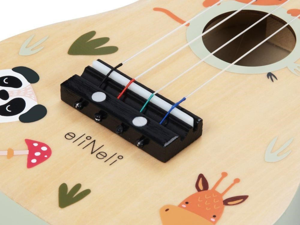 Kytara pre deti (ukulele) v farebnej kombinácii prírodného dreva a jemných pastelových farieb, s roztomilým motívom - so zvieratkami zo ZOO, premení každú holčičku aj chlapca na gitaristu. Hudobný nástroj v podobe detskej drevenej kytary, ktorú môžete aj naladiť, prebudí v deťoch lásku k hudbe, stimuluje zmysly, rozvíja detskú fantáziu a kreativitu.