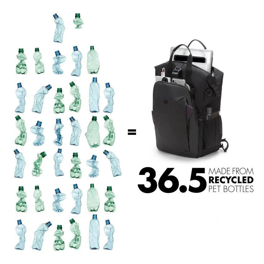 DICOTA is an official participant in the Microsoft Designed for Surface program, which certifies exceptional accessories created by third-party manufacturers to work seamlessly with Surface devices. The Eco Backpack Dual GO offers ideal protection for Surface laptops. The fit-all system separating wall in the notebook compartment lies protectively across your notebook and fits automatically to Surface devices up to 15". The slip pocket provides reliable protection for tablets up to 12.9". Easily convert from a shoulder bag to a backpack with tuck away backpack straps and a removable, padded shoulder strap. The spacious main section is divided so that documents and accessories can be stored separately. For even more storage space, the main compartment can be expanded with the help of a zipper. There is space for your water bottle or umbrella in the mesh pockets inside of the bag. Open expandable compartment for active gear such as sport shoes, helmet, yoga mat, etc. including elastic mesh side pockets and metal hook for fixation. The front pocket has practical compartments so you can organise smaller items like your smartphone, pens or chargers. Hidden zipped compartment for passport, wallet, etc. The bag is made of water-repellent material to protect the contents even on rainy days. Eco Backpack Dual GO is therefore perfect for you if you are always on the go and want to support the recycling of PET bottles with an eco-friendly bag. Made of 36.4 recycled PET bottles Compatible with any Surface Pro, Pro X, Laptop, Go, Laptop Go, Laptop SE, Book, Laptop Studio as well as Duo Padded notebook compartment with fit-all system for Surface devices up to 15" Slip pocket for tablets up to 12.9" Spacious main section with compartments for documents and accessories Front pocket with storage space for mobile accessories Open expandable compartment for active gear Extension zipper for more storage space Padded, removable shoulder straps to wear as backpack Mesh pocket for water bottle or umbrella in- and outside the bag Hidden zip-pocket for passport, wallet, etc. Water-repellent material More Information More Information Item number D31862-DFS Color black Volume in liters 0 Material 600D RPET Polyester Warranty Lifetime / 30 years EAN 7640186417679 Max. Device Measurements (mm) 385 x 35 x 265 mm 15.16 x 1.38 x 10.43 inch Product Measurements (mm) 310 x 425 x 160 mm 12.2 x 16.73 x 6.3 inch Weight 1.04 kg / 2.29 lbs.