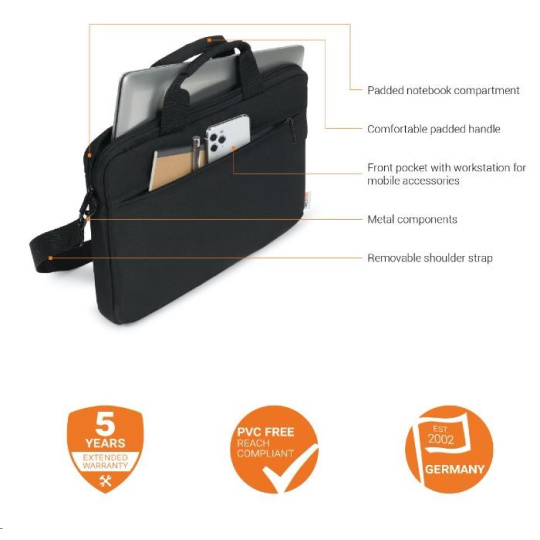Popis produktu Váš notebook doručí na miesto určenia bezpečne s tenkým puzdrom BASE XX. Hlavná priehradka je vybavená mimoriadne hrubým vypchávkou, čo znamená, že vaše zariadenie je úplne chránené pred nárazmi a otrasmi. Dokumenty a mobilné príslušenstvo, ako je váš smartfón, vizitky, perá a podobne, sú vždy ľahko dostupné v priehradke so zipsom na prednej strane. Nastaviteľný a odnímateľný ramenný popruh a držadlo robia tašku veľmi ľahko prenosnou. BASE XX kladie dôraz na odolnosť produktu s predĺženou päťročnou zárukou. Vypchávačná priehradka na notebook Vrecko na prednej strane s pracovnou plochou pre mobilné príslušenstvo Všetky strany vypchávky pre extra ochranu Vyššia kvalita kovových komponentov Pohodlné držadlo a odnímateľný ramenný popruh Obrázok sa môže mierne líšiť od originálu Ďalšie informácie Rozmery produktu 360 x 260 x 35 mm EAN 7640186417259 Materiál 300Dx300D Polyester Farba piesková hnedá