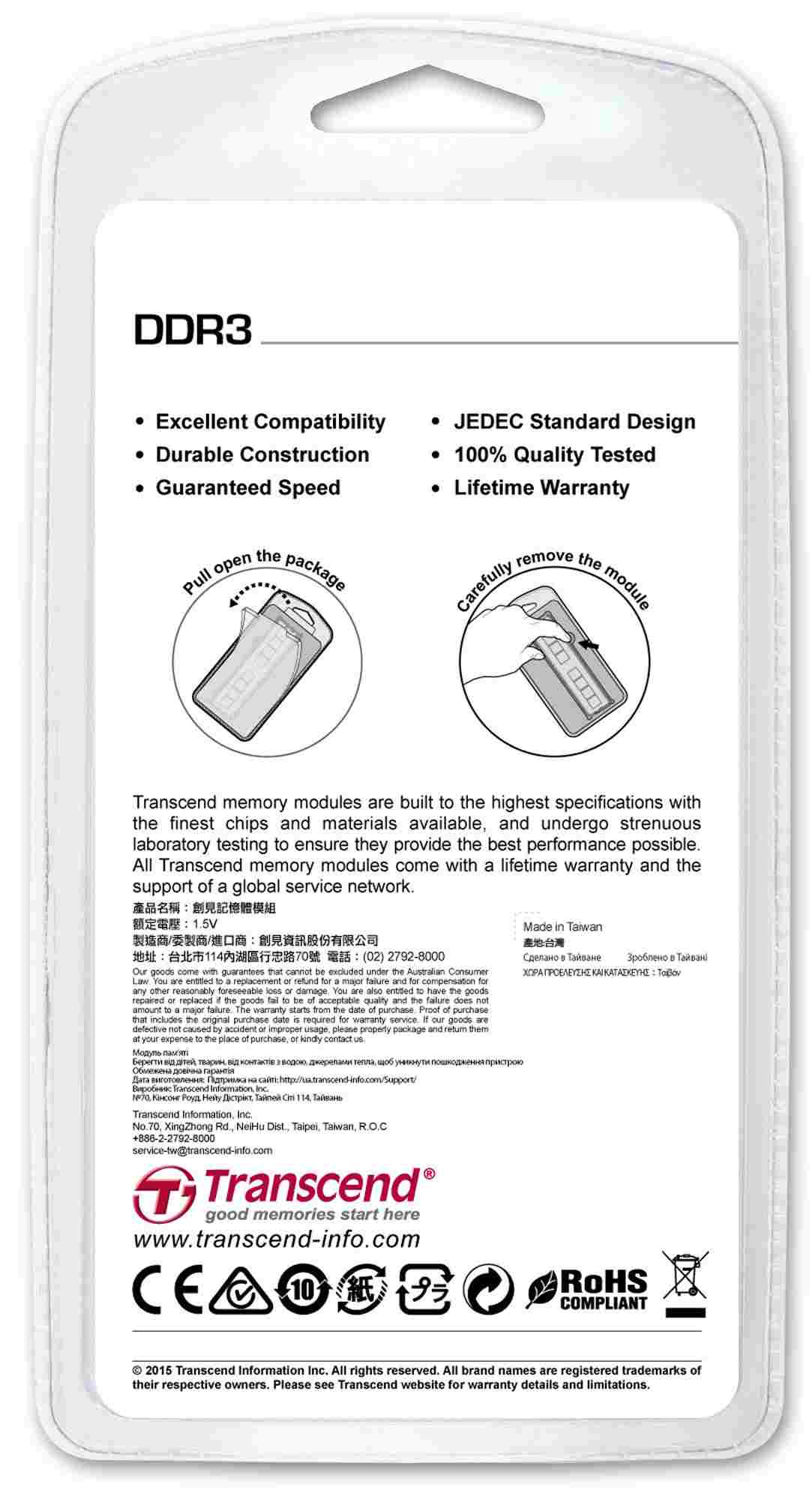 Pamäte DDR3 DIMM od spoločnosti Transcend, ktoré ponúkajú najlepšiu kombináciu spoľahlivosti, rýchlosti a stability, sú vyrobené z najkvalitnejších značkových čipov DRAM a sú prísne testované, aby sa zabezpečilo, že spĺňajú prísne požiadavky spoločnosti Transcend na celkovú kvalitu a výkon. Pamäte Transcend DDR3 unbuffered DIMM sú najstabilnejšie a najspoľahlivejšie v odvetví, čo z nich robí aj ekonomické riešenie pamäte pre všetky stolové počítače.
