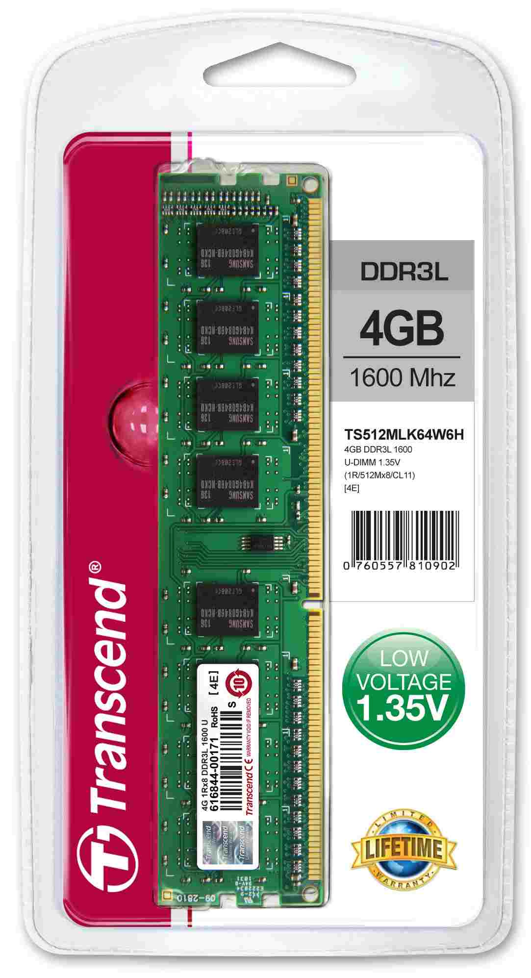 Pamäťové moduly Transcend sú vyrobené podľa prísnych špecifikácií z najlepších dostupných čipov a materiálov a prechádzajú náročným laboratórnym testovaním, aby sa zabezpečil najlepší možný výkon. Nízkonapäťové moduly DIMM Transcend DDR3 pracujú pri nominálnom napätí len 1.35 V, čo nielenže produkuje menej tepla, ale tiež znižuje elektrické zaťaženie pamäťového radiča a ponúka až 15 % úsporu energie v porovnaní so štandardným 1.5V.