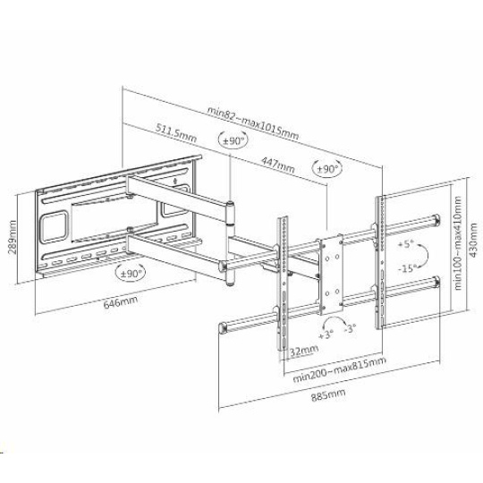Otáčanie TV 43-80" i kolmo ku stene na obe strany, dĺžka 82-1015mm, naklápanie, VESA 200x100 až 800x400, nosnosť 50kg Extra dlhý držiak pre otáčanie kolmo ku stene aj veľkých televízorov s uhlopriečkou až 80". Vďaka nastaviteľnej vzdialenosti od steny od 82mm až do 1015mm umožňuje držiak Ergosolid Largo otočenie o 90° na obe strany televízií s uhlopriečkami 43" až 80". Vďaka nosnosti 50kg a veľmi pevnej konštrukcii je polohovanie veľmi bezpečné a spoľahlivé. Televíziu je možné nakláňať +5° až -15° a korigovať rovinu obrazovky o +/-3°. Vďaka nástennému úchytu s rozmermi 646mm a 289mm sa celková hmotnosť držiaku s televízorom veľmi dobre rozloží na veľkú plochu, inštalácia je veľmi bezpečná. Na držiaku je bezpečnostné skrutky na zabezpečenie TV na držiaku a zamedzenie nechcenej vysadene alebo pádu TV. Farebné prevedenie čierne, materiál oceľ. Záruka 5 rokov. Technické údaje: nosnosť 50kg podporuje VESA štandardy 200x100 až 800x400 zavesenie a otáčanie kolmo ku stene TV 43" až 80" nastaviteľná vzdialenosť od steny 82mm až 1015mm možnosť naklápania televízie +5° až -15° korekcia roviny obrazovky +/- 3° inštalačný materiál súčasťou balenia (viď nižšie) veľmi pevná a bezpečná konštrukcia zabezpečenie TV na držiaku proti vysadeniu materiál oceľ hmotnosť držiaku 13,5kg veľká inštalačná plocha pre rozloženie hmotnosti na stene 646 x 289mm farebné prevedenie čierne záruka 5 rokov