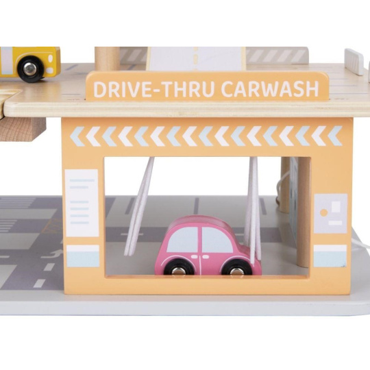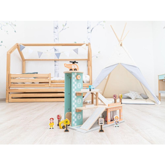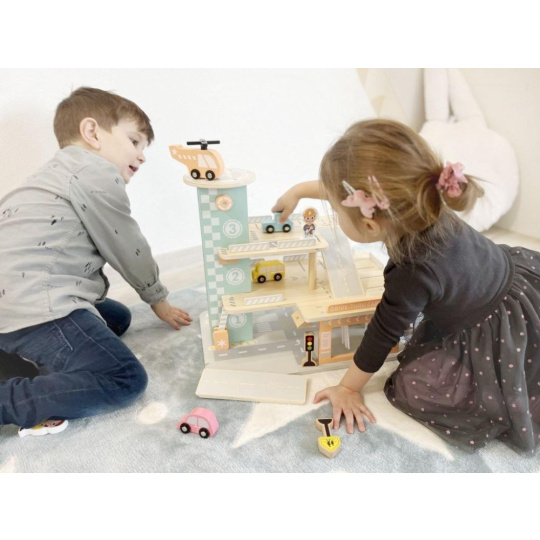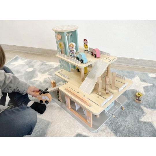 Garáž na autíčka s myčkou, v krásnych jemných farbách, prinesie deťom veľa zábavy. Súčasťou 3-poschodovej drevenej garáže je parádna myčka áut, tankovací stojan, výťah, helipad i množstvo parkovacích miest pre autíčka. Bohaté príslušenstvo v podobe helikoptéry, autíček, dopravných značiek a obsluhy garáže umožní, aby si s garážou pre autíčka vyhralo vaše dieťa samo alebo so svojimi kamarátmi.