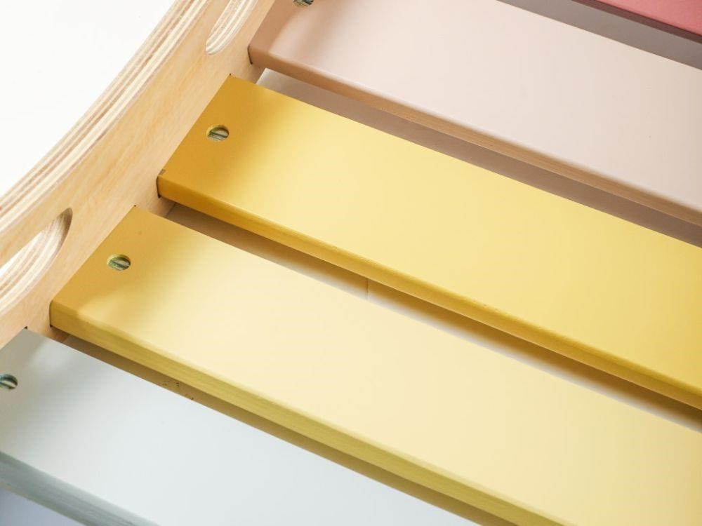 Vylepšená multifunkčná drevená hojdačka 5v1, s doskami v osviežujúcich fresh farbách, je zábavnou hračkou pre deti, ktorú využijú pri pohybových aktivitách aj pri hre. Montessori hojdačka umožní deťom príjemne sa pohupovať, výborne poslúži ako lezecká dráha, skluzavka, úkryt, most, stolička alebo predajný pultík pri hre na obchod. Hojdačka prirodzeným spôsobom rozvíja motorické schopnosti a je vhodná pre deti už od 1 roka.