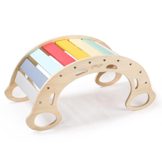 Vylepšený set multifunkčnej drevenej hojdačky 5v1 s doskou 2v1 hravo vytvorí malé detské ihrisko v detskej izbe. Montessori hojdačku s doskami vo sviežich fresh farbách deti využijú samostatne, ako zábavnú hračku pri množstve hier (skryš, most, predajná stánok, obchod) aj pohybových aktivít (hojdačka, lezecí rebrík, stolička) alebo v sete s lezeckou stenou a šmykľavkou v jednom. Farebný set prirodzeným spôsobom rozvíja motorické schopnosti a je vhodný pre deti už od 1 roka.