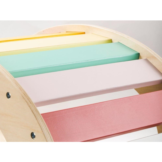 Vylepšený set multifunkčnej drevenej hojdačky 5v1 s doskou 2v1 hravo vytvorí malé detské ihrisko v detskej izbe. Montessori hojdačku s doskami vo sviežich fresh farbách deti využijú samostatne, ako zábavnú hračku pri množstve hier (skryš, most, predajná stánok, obchod) aj pohybových aktivít (hojdačka, lezecí rebrík, stolička) alebo v sete s lezeckou stenou a šmykľavkou v jednom. Farebný set prirodzeným spôsobom rozvíja motorické schopnosti a je vhodný pre deti už od 1 roka.