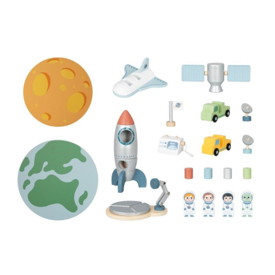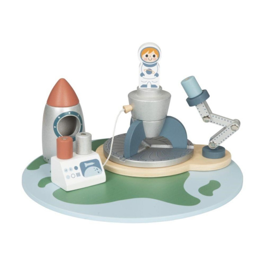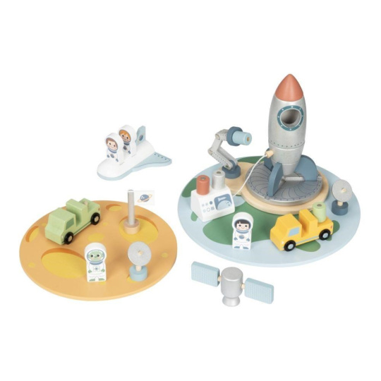 Drevená vesmírna základňa so spoustou drevených prvkov uvedie deti do vesmíru. Hračka umožňuje deťom rozložiť si základňu na Zemi aj vo vesmíre, naplánovať štart raketoplánu aj vesmírnu misiu na práve objavenej planéte. Súčasťou balenia sú rôzne dopravné prostriedky, satelity a astronauti.