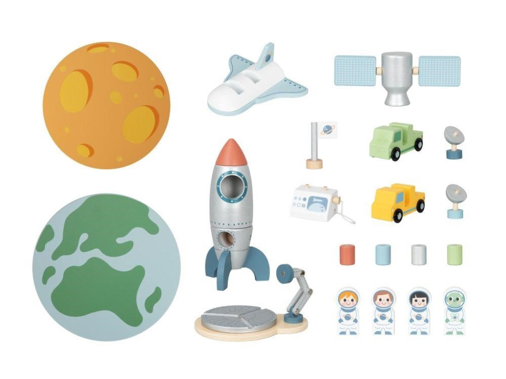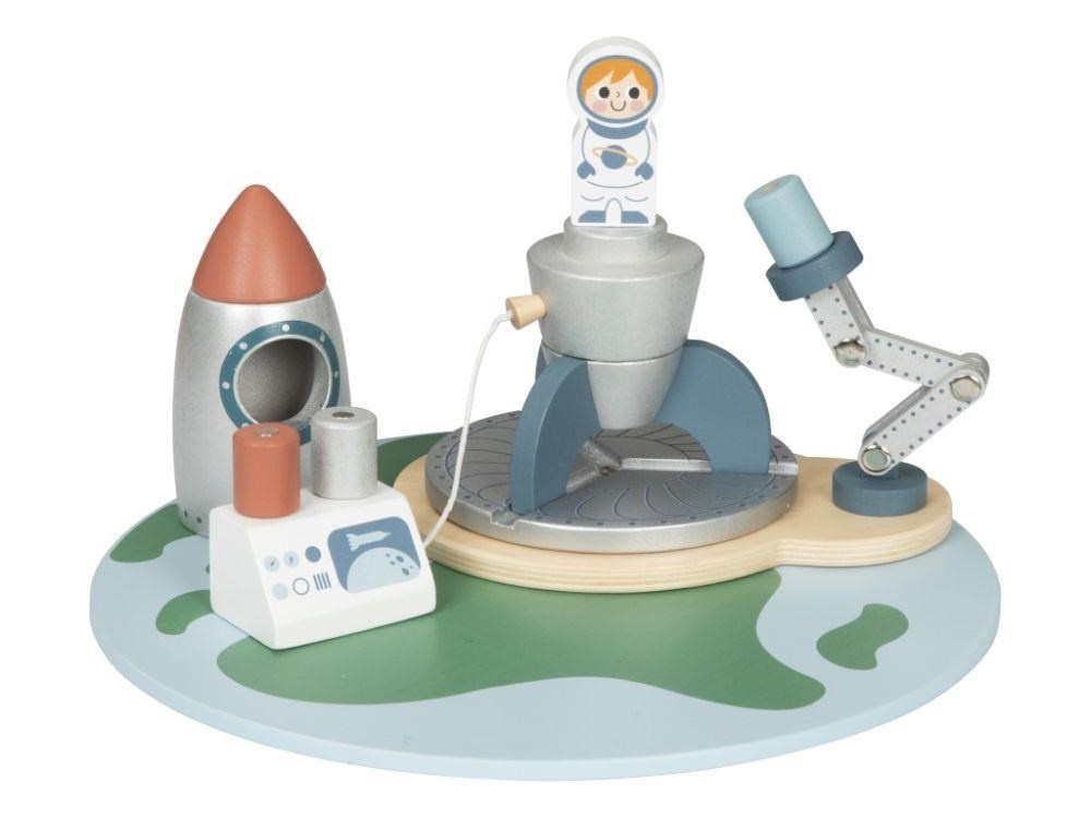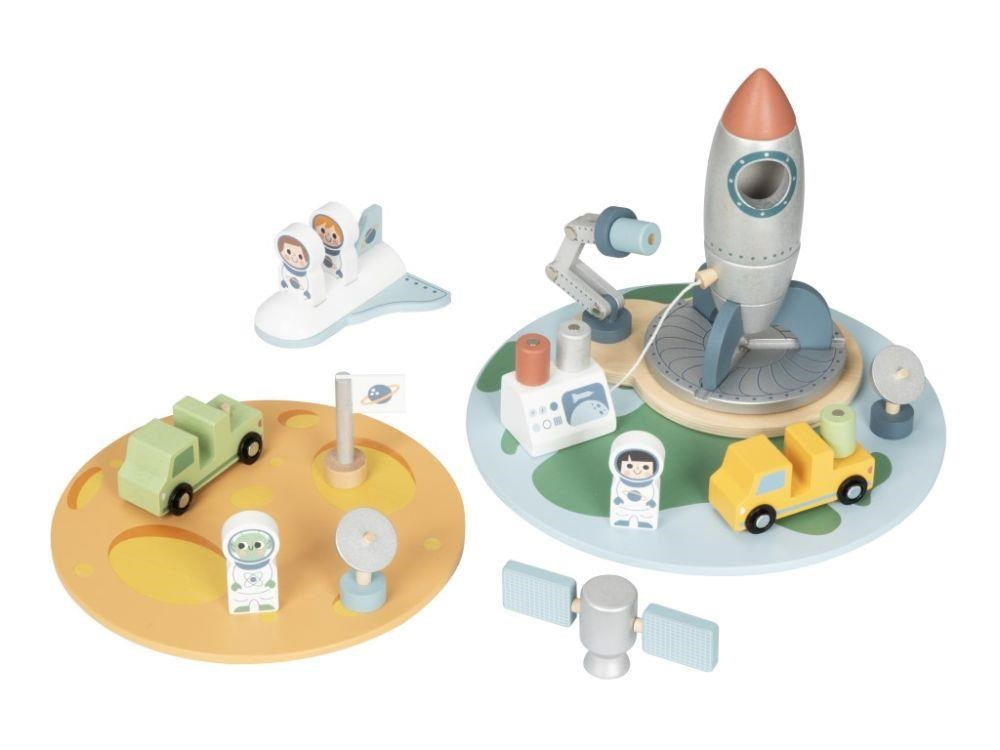 Drevená vesmírna základňa so spoustou drevených prvkov uvedie deti do vesmíru. Hračka umožňuje deťom rozložiť si základňu na Zemi aj vo vesmíre, naplánovať štart raketoplánu aj vesmírnu misiu na práve objavenej planéte. Súčasťou balenia sú rôzne dopravné prostriedky, satelity a astronauti.